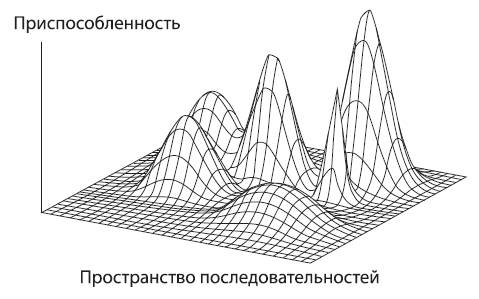 Примерно так представляют себе биологи «ландшафт приспособленности». Два горизонтальных измерения символизируют «белковую вселенную», т. е. все возможные аминокислотные последовательности белка (или нуклеотидные последовательности ДНК, если речь идет о «генетической вселенной»). Вертикальное измерение отражает приспособленность. Эволюционируя путем накопления нейтральных или полезных аминокислотных замен, белок может двигаться по этому ландшафту горизонтально или вверх. Спуск в долины запрещен, потому что мутации, снижающие эффективность работы белка, отсеиваются отбором. В результате белок может оказаться в «ловушке локального максимума», т. е. застрять на одной из второстепенных вершин. Однако реальные ландшафты приспособленности, по-видимому, представляют собой не множество одиноких пиков, а лабиринты горных хребтов. Двигаясь по гребням, белок может обходить пропасти, но на это уходит много времени. Именно поэтому некоторые белки, унаследованные современными организмами от последнего общего предка всего живого, до сих пор так и не достигли предельного уровня несхожести и продолжают медленно расходиться в пространстве «белковой вселенной».