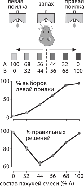 Крыс научили выбирать одну из двух поилок в зависимости от того, запах какого из двух пахучих веществ – А или Б – преобладает в воздухе. В роли вещества А выступала капроновая кислота, в роли вещества Б – 1-гексанол. Если крысе давали понюхать смесь с соотношением A/Б > 50/50, крыса должна была выбрать левую поилку, при А/Б < 50/50 – правую. За правильный выбор крысу награждали (давали каплю воды). Награда, однако, появлялась не сразу – крысу заставляли ждать у выбранной поилки, мучаясь неопределенностью, от 0,3 до 2 секунд.