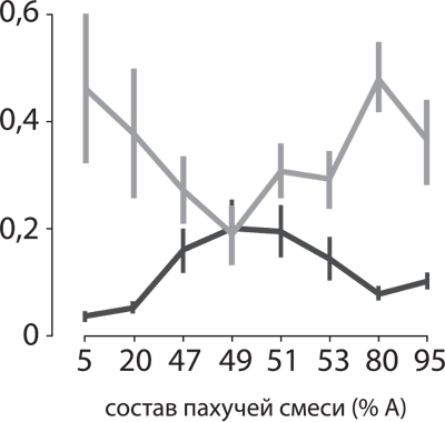 Меняя соотношение веществ А и Б в пахучей смеси, исследователи могли регулировать сложность задачи. Понятно, что чем ближе это соотношение к 50:50, тем труднее крысе сделать правильный выбор. Как и следовало ожидать, крысы ошибались тем чаще, чем сложнее была задача (см. нижний график на рисунке).