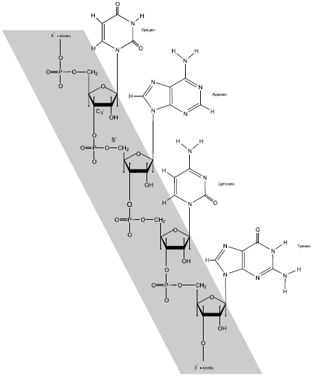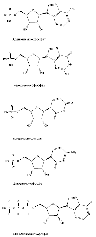 Четыре составных блока молекулы РНК – нуклеотиды аденозин (аденин + рибоза), гуанозин (гуанин + рибоза), уридин (урацил + рибоза) и цитидин (цитозин + рибоза), к каждому из которых присоединено по одному остатку фосфорной кислоты. АТФ (главная энергетическая молекула живой клетки) представляет собой аденозин с тремя фосфатами.