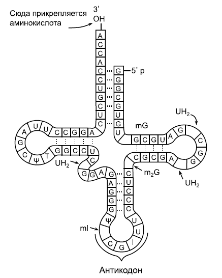 Схема транспортной РНК. А, G, С, U – стандартные нуклеотиды аденозин, гуанозин, цитидин и уридин, другими буквами отмечены нестандартные (модифицированные) нуклеотиды, в том числе I – инозин. Как и многие другие молекулы РНК, тРНК образует петли за счет того, что рибонуклеотиды попарно "склеиваются друг с другом по принципу комплементарности. Как можно видеть на рисунке, С (цитозин) обычно склеивается с G (гуанином), а А (аденин) – с U (урацилом). Но в биологии, как мы уже знаем, нет правил без исключений: в двух местах этой молекулы, вопреки принципу комплементарности, G соединяется с U.