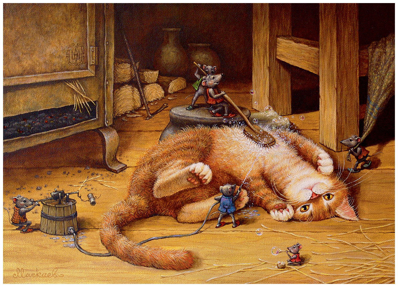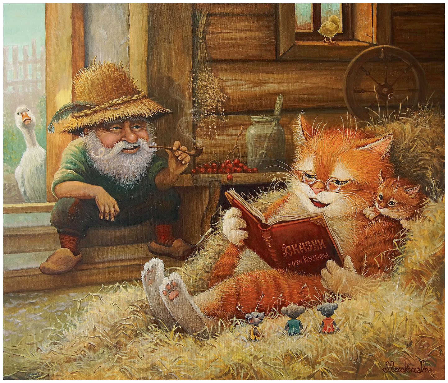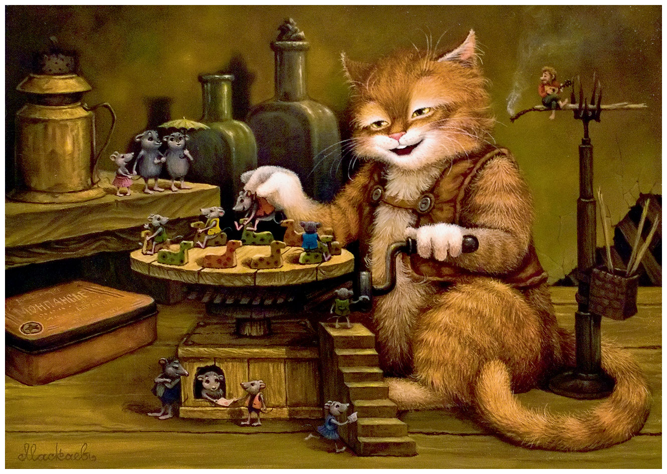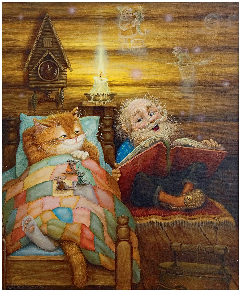 * * *В доме, где держат кота,Жизнь не бывает проста.Даже порой тишинаТайны волшебной полна.Кто там вздыхает в углу,Пламя колышет свечи?Может, анчутка[1] к теплу,К печке крадется в ночи?Кто там стучится листвойНочью в окна переплёт?Верно, седой домовойВ гости кикимору ждёт.Ведомо всё лишь коту,Кот – он всегда на посту,Пусть он и делает вид,Что спит.Жил на свете кот КузьмаШерстью рыж, усат весьма.Хоть с мышами был не воин,В остальном весьма достоин:Хвост трубою и умаЗакрома.В детстве был он домоседом,С дедом Васей вёл беседы.Шерсть Василия седа,Но охотник хоть куда!Хочет передать наукуВнуку.Но Кузьма зевал тайком,Был плохим учеником.Он любил прилечь у печки,Помечтать в тиши о речке,Хоть не знал наверняка,Где река.Как-то ночью Кузя рыжийВышел тихо в сени.Свет в полу из щели брызжет.Глядь – а там ступени.И ведут они под поломК норке-комнатушке:Лавки, свечки, столик полон,Ходики с кукушкой,Сохнут вещи после стирки,Писк весёлый слышен.Кто хозяева квартирки?Ну, конечно, мыши!– Вот бы с ними подружиться,Вот найти бы ключик!Мы б удили для ушицыПескарей да щучек,Сказки, лёжа бы на пузе,Слушали в саду мы…Как теперь поступит Кузя?Что же он задумал?А подумал Кузя так:Запах – вот мой главный враг!Как меня почует мышка,Тут уж сразу дружбе крышка.Норовит забиться в щёлкуПоскорей и втихомолку.Вот лежит-мурчит Кузьма кверху лапами.Гляньте: весь я на виду, всё-то видно вам!Мур-мур-мышки-детки с мамами, с папами,Выходите мыть кота безобидного!Но боятся мыши, жмутся под лавочкой,Возле печки под поленницей шаткою.Только мама-мышка с дочкою-лапочкойТак тихонечко подходит, с оглядкою.Остальные все хвостами защёлкали,Запищали, потянулись на цыпочках.Кузя им: «Вы подходите со щётками,А за это будут сыр вам да выпечка!»Пусть, конечно, мокротаНеприятна для кота,Иногда друзьям в угодуМожно вытерпеть и воду!Хорошо коту помыться,Шерсть продраить от душиКипятком, душистым мыльцем,Полотенцем досушить!К узя наш урчит, как трактор,И, что важно, он притомПахнет розовым экстрактом,Совершенно не котом!Кот с мышами дружбу водит– Вот так невидаль!Как сказали бы в народе –Не разлей вода!Как коты проводят дни?Кот, во-первых, спит на печке,Во-вторых, лежит в тени,В-третьих, дремлет на крылечке.Но с тех пор как свёл КузьмаДружбу тесную с мышами,Ни бедлам, ни кутерьмаКузе больше не мешали.Мышь на выдумки хитра,Да и кот совсем не промах.До полуночи с утраЖизнь ключом кипит в хоромах.Вот с улыбкой до ушейПод всеобщее весельеКот катает мал-мышейНа скрипучей карусели.Вечер. В дальние краяУплывает солнце рыбкой.Появляются рояль,Барабан, гармошка, скрипка.Их как будто лилипутСделал малого размера.Дирижёр встаёт за пульт,Начинается премьера.Всяк домашний на балу,И саксофонист в ударе.Мыши пляшут на полу,Кот играет на гитаре.Тут из погреба, сенейЛюбознательны и чутки,Кто пораньше, кто поздней,Собираются анчутки.Ну, а мыши шнырь-пошнырьС приглашеньем по округеДо кикимор до смешных,До самой Яги-подруги.Вот уж из лесной глуши,От лугов, болот нехожихНежить[2] всякая спешит,На больших стрекоз похожа.Ах, какой гремит концерт!Вышел саксофон из строя,Вдрызг гармошка, а в концеБарабан уже с дырою.Лишь один остался звук,Как затихли визг и вскрики:Это деда Васи внукПродолжал играть на скрипке.Но всему есть свой черёд,Хороводу, караваю…Скоро гости от щедротСтол под лампой накрывают.Тут от лешего гри