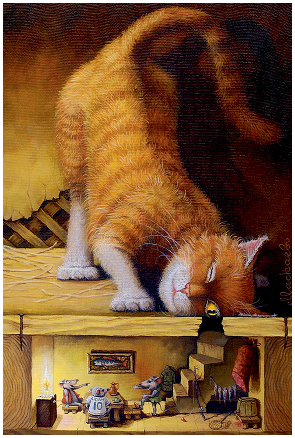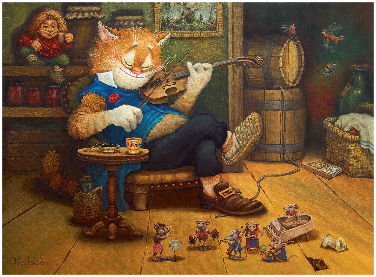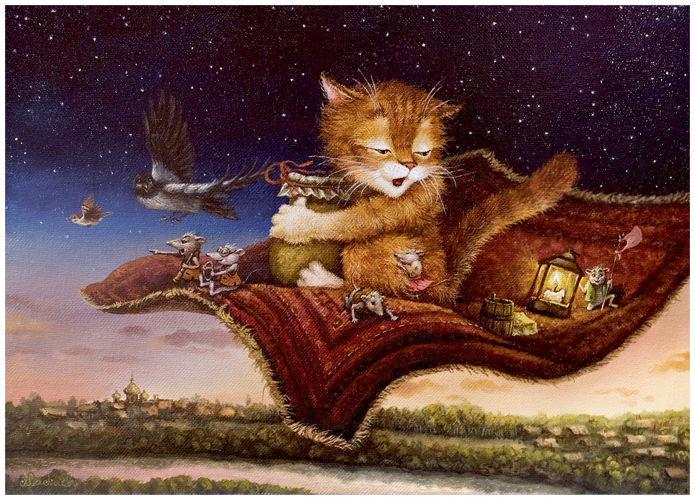 * * *В доме, где держат кота,Жизнь не бывает проста.Даже порой тишинаТайны волшебной полна.Кто там вздыхает в углу,Пламя колышет свечи?Может, анчутка[1] к теплу,К печке крадется в ночи?Кто там стучится листвойНочью в окна переплёт?Верно, седой домовойВ гости кикимору ждёт.Ведомо всё лишь коту,Кот – он всегда на посту,Пусть он и делает вид,Что спит.Жил на свете кот КузьмаШерстью рыж, усат весьма.Хоть с мышами был не воин,В остальном весьма достоин:Хвост трубою и умаЗакрома.В детстве был он домоседом,С дедом Васей вёл беседы.Шерсть Василия седа,Но охотник хоть куда!Хочет передать наукуВнуку.Но Кузьма зевал тайком,Был плохим учеником.Он любил прилечь у печки,Помечтать в тиши о речке,Хоть не знал наверняка,Где река.Как-то ночью Кузя рыжийВышел тихо в сени.Свет в полу из щели брызжет.Глядь – а там ступени.И ведут они под поломК норке-комнатушке:Лавки, свечки, столик полон,Ходики с кукушкой,Сохнут вещи после стирки,Писк весёлый слышен.Кто хозяева квартирки?Ну, конечно, мыши!– Вот бы с ними подружиться,Вот найти бы ключик!Мы б удили для ушицыПескарей да щучек,Сказки, лёжа бы на пузе,Слушали в саду мы…Как теперь поступит Кузя?Что же он задумал?А подумал Кузя так:Запах – вот мой главный враг!Как меня почует мышка,Тут уж сразу дружбе крышка.Норовит забиться в щёлкуПоскорей и втихомолку.Вот лежит-мурчит Кузьма кверху лапами.Гляньте: весь я на виду, всё-то видно вам!Мур-мур-мышки-детки с мамами, с папами,Выходите мыть кота безобидного!Но боятся мыши, жмутся под лавочкой,Возле печки под поленницей шаткою.Только мама-мышка с дочкою-лапочкойТак тихонечко подходит, с оглядкою.Остальные все хвостами защёлкали,Запищали, потянулись на цыпочках.Кузя им: «Вы подходите со щётками,А за это будут сыр вам да выпечка!»Пусть, конечно, мокротаНеприятна для кота,Иногда друзьям в угодуМожно вытерпеть и воду!Хорошо коту помыться,Шерсть продраить от душиКипятком, душистым мыльцем,Полотенцем досушить!К узя наш урчит, как трактор,И, что важно, он притомПахнет розовым экстрактом,Совершенно не котом!Кот с мышами дружбу водит– Вот так невидаль!Как сказали бы в народе –Не разлей вода!Как коты проводят дни?Кот, во-первых, спит на печке,Во-вторых, лежит в тени,В-третьих, дремлет на крылечке.Но с тех пор как свёл КузьмаДружбу тесную с мышами,Ни бедлам, ни кутерьмаКузе больше не мешали.Мышь на выдумки хитра,Да и кот совсем не промах.До полуночи с утраЖизнь ключом кипит в хоромах.Вот с улыбкой до ушейПод всеобщее весельеКот катает мал-мышейНа скрипучей карусели.Вечер. В дальние краяУплывает солнце рыбкой.Появляются рояль,Барабан, гармошка, скрипка.Их как будто лилипутСделал малого размера.Дирижёр встаёт за пульт,Начинается премьера.Всяк домашний на балу,И саксофонист в ударе.Мыши пляшут на полу,Кот играет на гитаре.Тут из погреба, сенейЛюбознательны и чутки,Кто пораньше, кто поздней,Собираются анчутки.Ну, а мыши шнырь-пошнырьС приглашеньем по округеДо кикимор до смешных,До самой Яги-подруги.Вот уж из лесной глуши,От лугов, болот нехожихНежить[2] всякая спешит,На больших стрекоз похожа.Ах, какой гремит концерт!Вышел саксофон из строя,Вдрызг гармошка, а в концеБарабан уже с дырою.Лишь один остался звук,Как затихли визг и вскрики:Это деда Васи внукПродолжал играть на скрипке.Но всему есть свой черёд,Хороводу, караваю…Скоро гости от щедротСтол под лампой накрывают.Тут от лешего гри