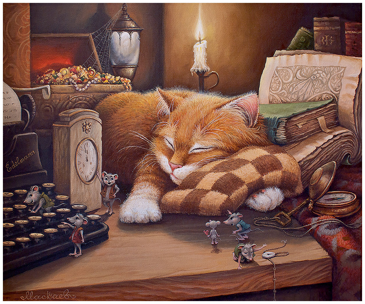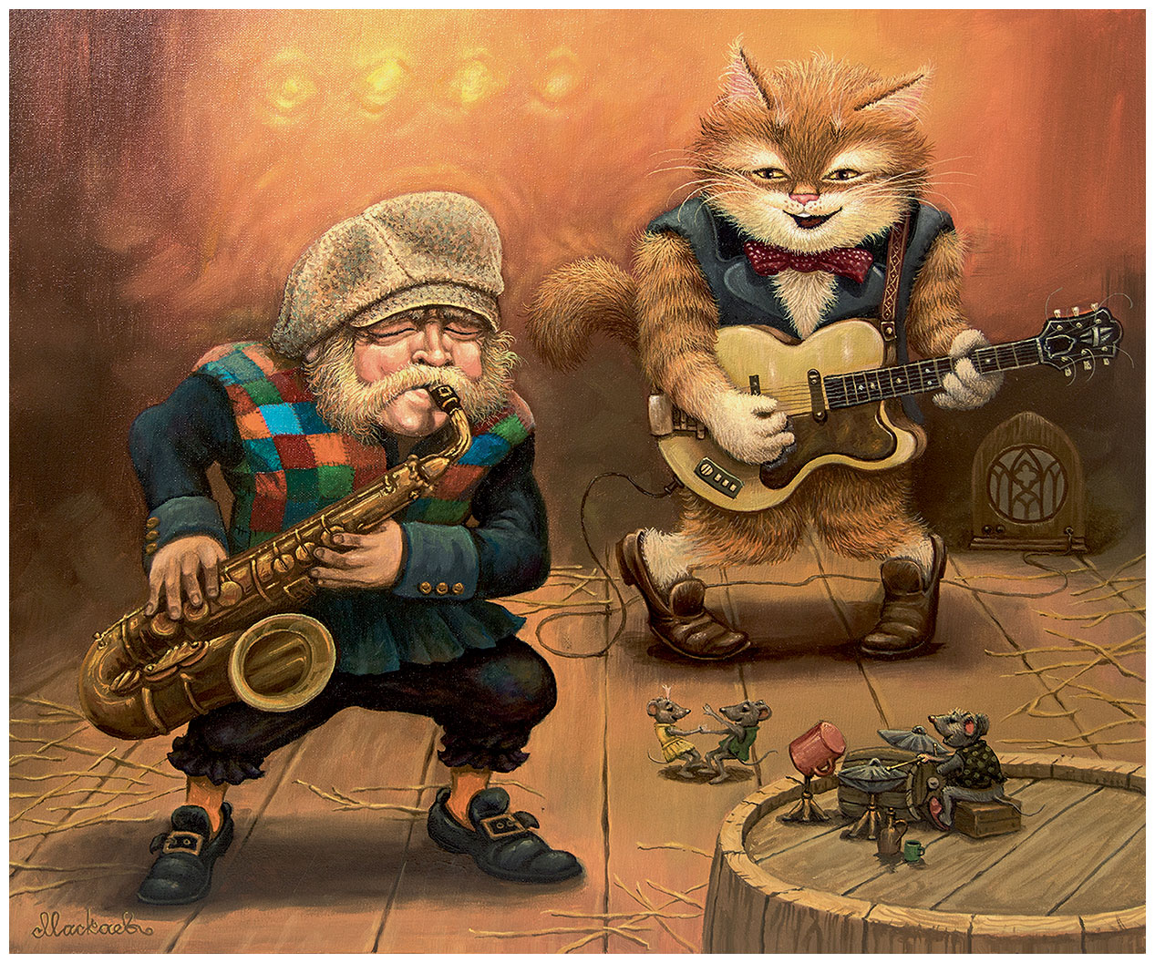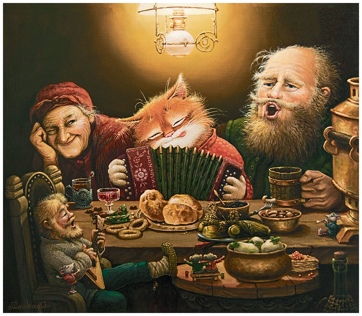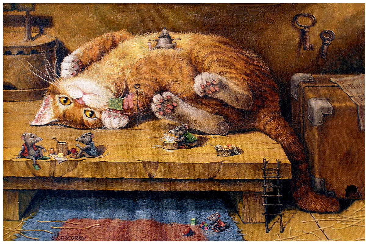 * * *В доме, где держат кота,Жизнь не бывает проста.Даже порой тишинаТайны волшебной полна.Кто там вздыхает в углу,Пламя колышет свечи?Может, анчутка[1] к теплу,К печке крадется в ночи?Кто там стучится листвойНочью в окна переплёт?Верно, седой домовойВ гости кикимору ждёт.Ведомо всё лишь коту,Кот – он всегда на посту,Пусть он и делает вид,Что спит.Жил на свете кот КузьмаШерстью рыж, усат весьма.Хоть с мышами был не воин,В остальном весьма достоин:Хвост трубою и умаЗакрома.В детстве был он домоседом,С дедом Васей вёл беседы.Шерсть Василия седа,Но охотник хоть куда!Хочет передать наукуВнуку.Но Кузьма зевал тайком,Был плохим учеником.Он любил прилечь у печки,Помечтать в тиши о речке,Хоть не знал наверняка,Где река.Как-то ночью Кузя рыжийВышел тихо в сени.Свет в полу из щели брызжет.Глядь – а там ступени.И ведут они под поломК норке-комнатушке:Лавки, свечки, столик полон,Ходики с кукушкой,Сохнут вещи после стирки,Писк весёлый слышен.Кто хозяева квартирки?Ну, конечно, мыши!– Вот бы с ними подружиться,Вот найти бы ключик!Мы б удили для ушицыПескарей да щучек,Сказки, лёжа бы на пузе,Слушали в саду мы…Как теперь поступит Кузя?Что же он задумал?А подумал Кузя так:Запах – вот мой главный враг!Как меня почует мышка,Тут уж сразу дружбе крышка.Норовит забиться в щёлкуПоскорей и втихомолку.Вот лежит-мурчит Кузьма кверху лапами.Гляньте: весь я на виду, всё-то видно вам!Мур-мур-мышки-детки с мамами, с папами,Выходите мыть кота безобидного!Но боятся мыши, жмутся под лавочкой,Возле печки под поленницей шаткою.Только мама-мышка с дочкою-лапочкойТак тихонечко подходит, с оглядкою.Остальные все хвостами защёлкали,Запищали, потянулись на цыпочках.Кузя им: «Вы подходите со щётками,А за это будут сыр вам да выпечка!»Пусть, конечно, мокротаНеприятна для кота,Иногда друзьям в угодуМожно вытерпеть и воду!Хорошо коту помыться,Шерсть продраить от душиКипятком, душистым мыльцем,Полотенцем досушить!К узя наш урчит, как трактор,И, что важно, он притомПахнет розовым экстрактом,Совершенно не котом!Кот с мышами дружбу водит– Вот так невидаль!Как сказали бы в народе –Не разлей вода!Как коты проводят дни?Кот, во-первых, спит на печке,Во-вторых, лежит в тени,В-третьих, дремлет на крылечке.Но с тех пор как свёл КузьмаДружбу тесную с мышами,Ни бедлам, ни кутерьмаКузе больше не мешали.Мышь на выдумки хитра,Да и кот совсем не промах.До полуночи с утраЖизнь ключом кипит в хоромах.Вот с улыбкой до ушейПод всеобщее весельеКот катает мал-мышейНа скрипучей карусели.Вечер. В дальние краяУплывает солнце рыбкой.Появляются рояль,Барабан, гармошка, скрипка.Их как будто лилипутСделал малого размера.Дирижёр встаёт за пульт,Начинается премьера.Всяк домашний на балу,И саксофонист в ударе.Мыши пляшут на полу,Кот играет на гитаре.Тут из погреба, сенейЛюбознательны и чутки,Кто пораньше, кто поздней,Собираются анчутки.Ну, а мыши шнырь-пошнырьС приглашеньем по округеДо кикимор до смешных,До самой Яги-подруги.Вот уж из лесной глуши,От лугов, болот нехожихНежить[2] всякая спешит,На больших стрекоз похожа.Ах, какой гремит концерт!Вышел саксофон из строя,Вдрызг гармошка, а в концеБарабан уже с дырою.Лишь один остался звук,Как затихли визг и вскрики:Это деда Васи внукПродолжал играть на скрипке.Но всему есть свой черёд,Хороводу, караваю…Скоро гости от щедротСтол под лампой накрывают.Тут от лешего гри