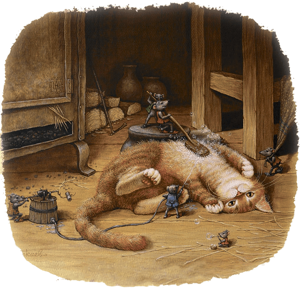 Словно из ниоткуда появились мыши в клеёнчатых передниках, притащили щётку, мыло и ковш воды. Кузьма, глядя на это, обречённо вздохнул. Он понял, что Жула придумала это как испытание – ведь он терпеть не мог воды. «И… эх, – подумал Кузьма, – обряд так обряд!» И собрав всё своё мужество, улёгся на полу около буржуйки, зажмурившись и готовясь совершить подвиг во имя дружбы.