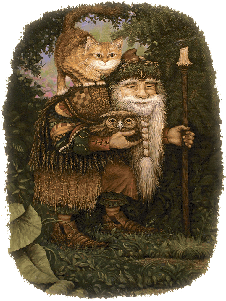 Кузя со всей прыти побежал в лес. Забравшись в чащу и повертевшись на месте, он прищурил глаза и стал выбирать себе ореховый пруток. Перебрав несколько веточек, Кузьма услышал потрескивание сучков и шорох листьев. Он оглянулся, но не увидел ровным счётом никого, хотя звуки, похожие на тяжёлые шаги, приближались. Бедный Кузя оторопел, глядя во все глаза. И тут прямо перед ним стала появляться из листвы, веток и травы непонятная большая фигура, напоминавшая дерево. Кузя услышал звук, похожий одновременно на скрип и смех. Фигура стряхнула с себя листья, мох, шумно вздохнула и превратилась в огромного деда с седой бородой и очень живыми глазами изумрудного цвета. Одет он был в необычный кафтан, который сверху состоял из разноцветных лоскутов, а заканчивался снизу древесной корою, ветками и корнями. На шапке у деда росли грибы и куст земляники. В одной руке он держал посох с затухшей на нём свечой, а на другой руке сидел нахохленный филин с оранжевыми глазами.