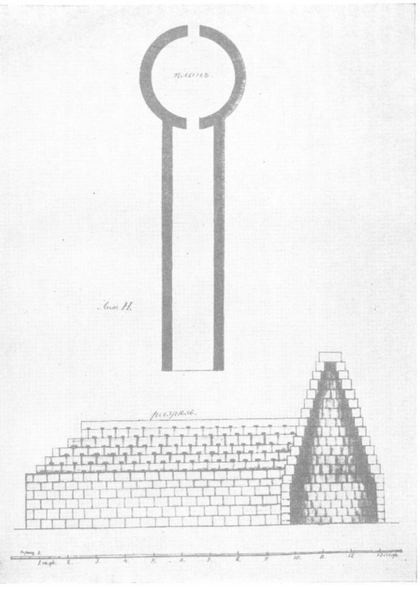 Рис. 7. Золотой курган. План и продольный разрез. Чертеж Карейши [41]