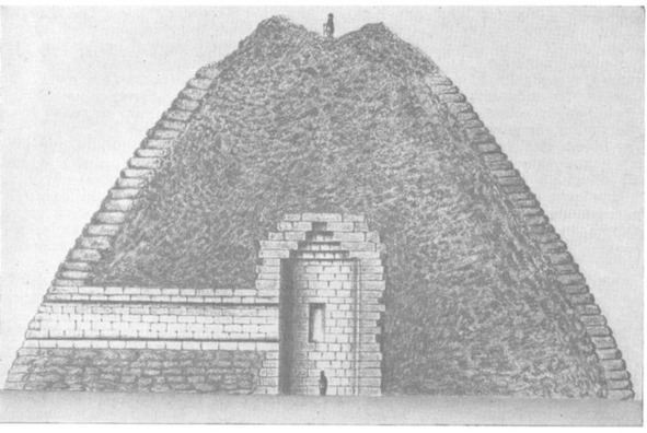 Это самое совершенное в техническом и художественном отношении сооружение данного типа. Длинный дромос с уступчатым покрытием мастерски соединен с квадратной камерой, которая перекрыта пирамидальным сводом: с каждой стороны выдвинуто по 7 уступов (рис. 11). Снаружи к дромосу пристроен портал с антами, увенчанными фронтоном.