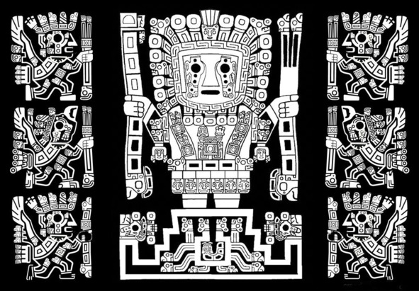 – «Фигуры с крылатыми людьми и головами кондоров обращены к большой центральной фигуре Бога, словно в обожании, и каждый держит перед собой жезл или скипетр»;