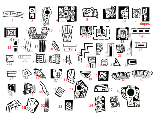 1 – символ меандр, дни года; 2 – две концентрические окружности – лунные дни; 3 – Земля со спутниками (которые были раньше), 4 – Земля и разные Луны (Лея, Фатта, Месяц), 5 – ягуар и детали для подсчета орбиты Меркурия; 6 – Марс со спутниками, 6а – кондор; 6 прим – примечание для високосного года; 7 – Уран со спутниками, 8 – Венера, для подсчета орбиты; 9 и 10 – Венера – комета, разрушающая систему, на поверхности тела – семь треугольников по количеству эпох; 11 – ближайшая к Солнцу планета – Меркурий; 12 – аналог 9 и 10 – Венера – комета, разрушитель; 13 (13А и 13Б) – спутники Марса Фобос и Деймос; 14 – три зачерненных прямоугольника для подсчета синодической орбиты Венеры; 15, 16 и 17 – зачерненные и белые прямоугольники в жезле – для подсчета орбиты Марса в периоды до и после катастрофы; 18 – сдвоенные прямоугольники для подсчета орбиты; 19 – две опоры Верховного Бога; 20 – ступени пирамиды, символизирующие ступени развития и катастроф; 21- зона, участвующая в катастрофе; 22 – выступы или опора для Луны, соответствующие определенной эпохе; 23 – аналогично 6 с добавлением трех зон над кондором, изображающим Марс, для подсчёта времени орбиты; 24 – белая узкая полоска для подсчете времени обращения спутников Марса; 25 – прямоугольник зачерненный – одна из зон для подсчета синодической орбиты Венеры после катастрофы; 26 – прямоугольник белый – одна из зон для подсчета синодической орбиты Венеры до катастрофы 26а – половинка; 27 – Юпитер с четырьмя спутниками в период до катастрофы; 28 – Юпитер с четырьмя спутниками в период после катастрофы; 29 – Сатурн со спутниками, число которых равно количеству перьев; 30 – после катастрофы, после воздействия кометы, признаком которой является расщепленный на три части хвост; 31 – нос Верховного Бога и одновременно деталь для подсчёта; 32 – ключ для начала подсчета долей для нахождения дней солнцестояния и равноденствия; 33 – рот Верховного Бога и одновременно элемент для подсчета; 34 – опора Верховного Бога из двух частей, элемент для подсчета; 35 – одна из фигур, играющая несколько функций: или для подсчета синодической орбиты, или для удвоения; 36 – ягуар и прямоугольные фигурки для подсчете орбиты разных Лун; 37 – рука Верховного Бога с четырьмя пальцами и одновременно учетверение для отдельных случаев; 38 – тоже, что и 28 – Сатурн; 39 – элемент полукруга с четырьмя выступами, имеющий несколько функций, в том числе, четыре эпохи по числу выступов и пятая эпоха – овал; 40 – образ кондора с «разбитой мордой» после катастрофы; 41 и 42 – короны пернатых божеств и одновременно указатель характера и эпох воздействия; 43 – зачерненная рука пернатого божества в нижнем ряду, где она не является признаком умножения по числу пальцев; 44 – Юпитер в период катастрофы с указанием на возникновение новых небесных тел (спутников); 45 – нападающий кондор в связке с Сатурном; 46 – отдельный символ меандра, а также положение Земли до катастрофы; 47 – процессы, происходящие с Землей и её спутниками при катастрофе; 48 – плачущий Верховный Бог получается потому, что создатели календаря в области глаз нарисовали кружочки или слезы от пропадающих Лун; 49 – ступня пернатого божества и одновременно элементы для подсчетов; 50 – кондор и полоска – часть системы, подвергающаяся нападению; 51 – расщепленный на три части хвост – признак нападения кометы; 52 – поверженн