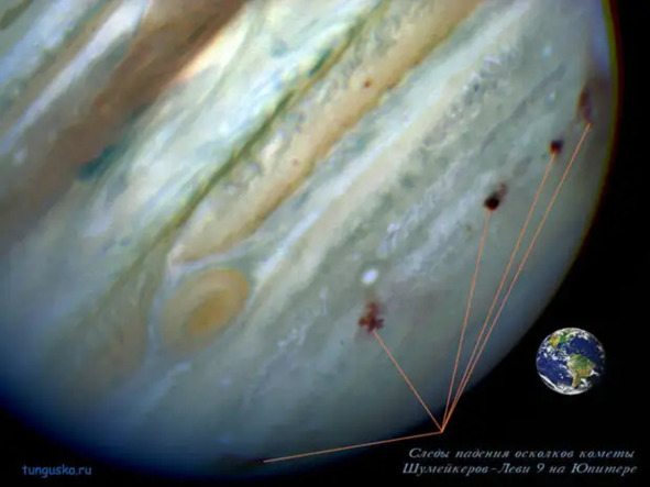 В 2009 году огромная комета столкнулась с Юпитером. Специалисты оценили диаметр упавшего тела в 200—500 метров. Сила взрыва на Юпитере была в тысячи раз мощнее Тунгусского метеорита и составляла 12 500—13 000 мегатонн в тротиловом эквиваленте, что более чем в миллион раз мощнее бомбы, сброшенной на Хиросиму. Если бы эта комета не была захвачена притяжением Юпитера, а столкнулась с Землей, то на нашей планете полностью была бы уничтожена любая жизнь и уже ни что не могло бы ее возродить [113]