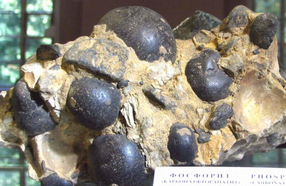 Рис. 23. Фосфорит (карбонат-фторапатит). Конкреции в песчанике. Ушица р., близ г. Каменец-Подольский, Хмельницкая обл., Зап. Украина [56].