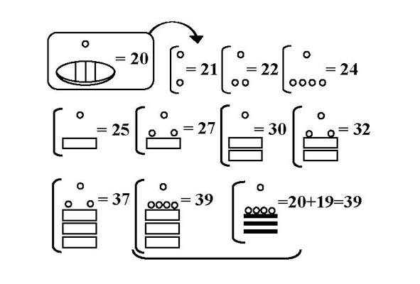 При записи числа 20 точка единицы перемещается в верхнюю позицию (как и единица в десятичной системе), а знак нуля занимает нижнюю позицию единиц, а знак нуля специфическая «раковина» занимает нижнюю позицию единиц [42]