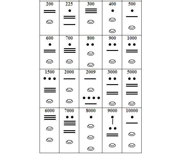 Для точного подсчета следует познакомиться с таблицей исчислений у майя от 200 до 10000 – рис. 16. В ней можно найти значения, похожие на те, что показаны на рис. 15.