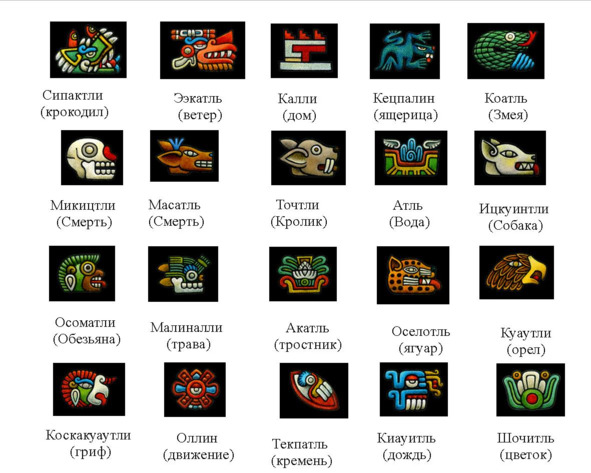 У майя и ацтеков 20-дневный месяц. Названия и изображения дней месяца представлены на рис. 22.