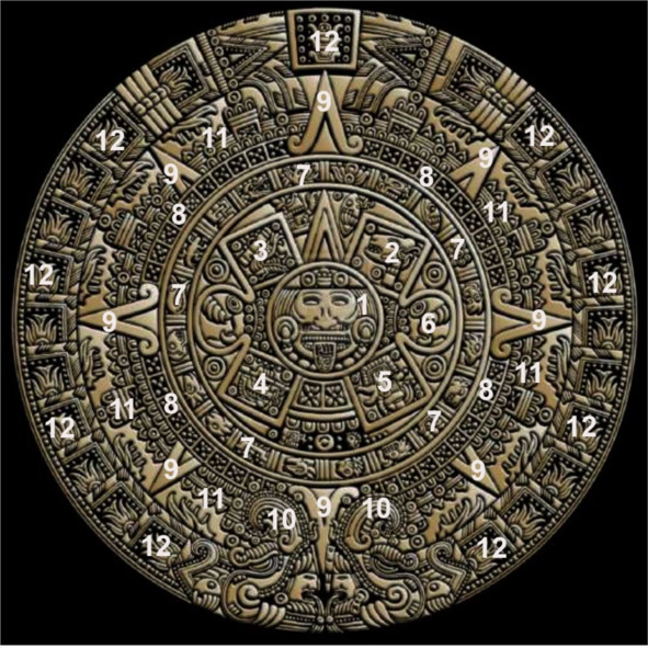 Обозначения: 1 – Бог Солнца Тонатиу; 2 – изображение эры Первого Солнца, 3 —изображение эры Второго Солнца, 4 – изображение эры Третьего Солнца, 5 – изображение эры Четвертого Солнца, 6 – изображение эры Пятого Солнца, 7 – 20 дней гражданского календаря «Хааб» и здесь же, прецессионные годовые циклы ближних планет – Меркурия и Венеры, 8 – наличие пяти точек в прямоугольниках символизируют пять эпох, 9 – стороны света, 10 – Огненные змеи, 12 – 20 недель священного календаря «Цолькин»; вместе 8, 11 и 12 – прецессионные циклы дальних планет: Земли, Марса, Юпитера, Сатурна, Урана и Нептуна.