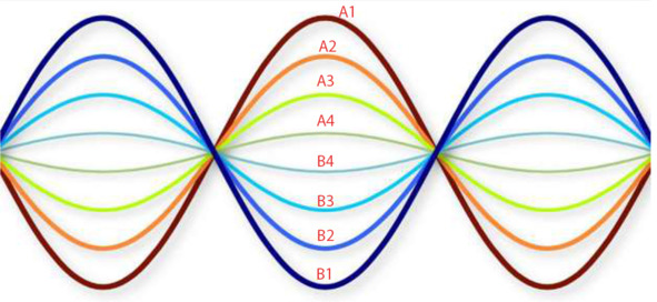 На рис. 33 представлены стоячие волны. Их амплитуда зависит от амплитуды бегущих волн в одну сторону – А1, А2, А3, А4 и в отраженную или обратную сторону – В1, В2, В3, В4. Максимальной бегущей и отраженной волне соответствует и максимальная бегущая волна.