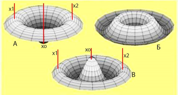 На рис. 34 представлены три случая для стоячих волн. Представим себе, что в центре расположен объект (камень). Указанное условие (1) выполняется в области расположения всего камня между линиями х1 и х2. В случае В (нижний), в центре расположена пучность стоячей волны и соответствующее минимальное звуковое давление. В этом случае камень будет стремиться как бы соскользнуть с этого места и силы разницы звукового давления направят его вниз. В случае А (изображен слева) в центре имеется узел стоячей волны и максимальное давление, именно в этом случае звуковое давление будет выталкивать камень вверх.