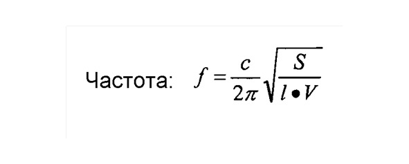 Формула для вычисления частоты резонансной камеры Гельмгольца с выводным окном можно представить так