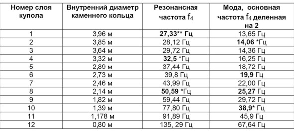 – резонансы на воздухе на внутренней поверхности каменных колец купола дают дополнительные резонансы, близкие ко второму (14,1 Гц), третьему (20,3 Гц), четвертому (26,4 Гц) и пятому (32,4 Гц) резонансам Шумана: