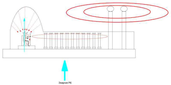 Далее этот поток усиливается куполом и через систему поступает на стержневой резонатор- колонну. Эта колонна и будет формировать колонию жизни, подчинённую человеку, создавшему кольцо РА ТОРА. Кольцо РА ТОРА можно возбуждать на правое морское полушарие, что делали египтяне и атланты.
