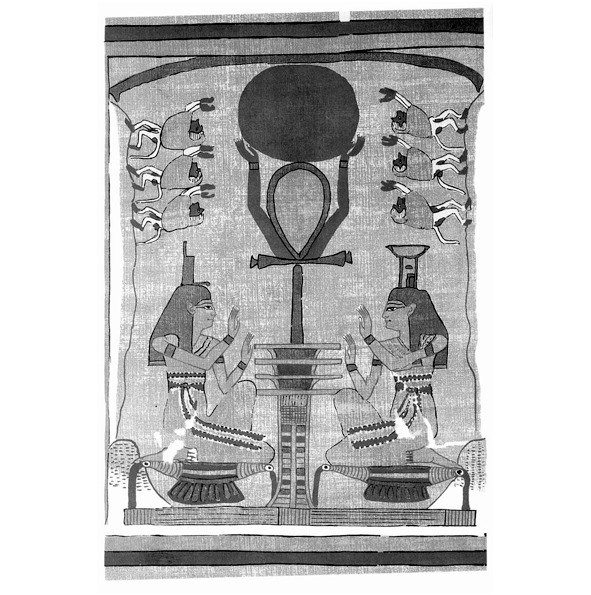 Учитывая, что древняя письменность была построена на смысловой основе, отбросим мистику и дадим чисто физическую трактовку изображениям на картинке. Два правителя, изображённых в позе разговора, путём использования технических средств – посредством организации линии связи с использованием джеда и анха, которые поддерживаются энергией Ра, договорились о решении трёх проблем. Соседство бабуинов – проблема даже в настоящее время. Получается вполне прагматичная картина.
