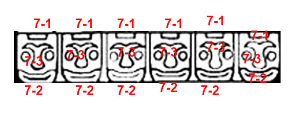 Для определения обозначения Урана на календаре, следует начать с конца. Уран – предпоследняя планета по удаленности от Солнца. Следовательно, в календаре Тиуанако на картинке Верховного Бога следует найти предпоследний элемент. Верховный Бог стоит на пирамиде, внутри которой заперты агрессивные элементы. Что же касается изображении самого Верховного Бога, то предпоследним элементом его одежды, похожим на края платья, являются шесть лиц – рис. 73. Создатели календаря решили обратить наше внимание не на планету Уран в целом, а на её основные шесть спутников. По-видимому, в процессе катастрофы, именно спутники поверглись наибольшим изменениям. Подсчет здесь можно вести по количеству одинаковых элементов, например, по шести белым черточкам 7—1, по шести одинаковым фигурам рта 7—2, по шести изображениям носа 7—3. Если все это сложить, то получим 18 элементов, а с учетом 20 месяцев – всего синодический период Урана получается равным 360 «урановым» дням. Сейчас эта цифра составляет 369,7 дней, изменение за прошедшее время составляет 2,7%.