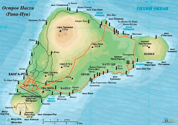 Статуи есть не только на острове Пасхи. В створе или продолжении этого подводного хребта Сала-и-Гомес, в нескольких тысячах километров к западу, находятся острова Питкерн и Раивавае (до острова Питкерна от Рапа-Нуи около 2 тысяч километров, до Раивавае – более 4 тысяч). На этих островах тоже высекались каменные изваяния, некоторые исследователи сближают их с моаи острова Пасхи. Есть гипотеза о том, что все эти каменные статуи высекались каким-то народом-пришельцем с востока или с запада. Но, быть может, сходство статуй объясняется простым сходством вулканических туфов, образовавших острова Пасхи, Питкерн, Раивавае [150].