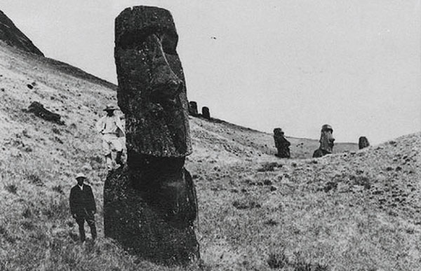 Первое серьезное исследование статуй на острове Пасхи было проведено в 1914–1915 годах англичанкой Кэтри Рутледж. Ей была составлена карта острова с нанесенными вулканом Рано Рараку, где были высечены большая часть колоссов, всего около 400 статуй [124].