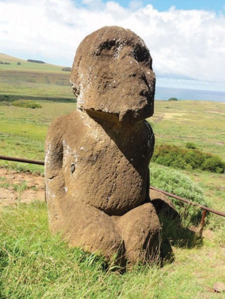 Из всех археологических чудес на Рано Рараку есть одно, о котором знает довольно мало туристов, и которое, пожалуй, самое необычное из всех. Это бородатый Тукутури (рис. 33), который является единственным в своем роде моаи – он стоит на коленях. Поза Тукутури впоследствии была использована женщинами и мужчинами, которые участвовали в хоре во время фестивалей, известных как «Риу». В частности, певцы становятся на колени, немного наклоняют туловище назад и приподнимают голову. Также при этом исполнители, как правило, носят бороды (Тукутури бородатый).