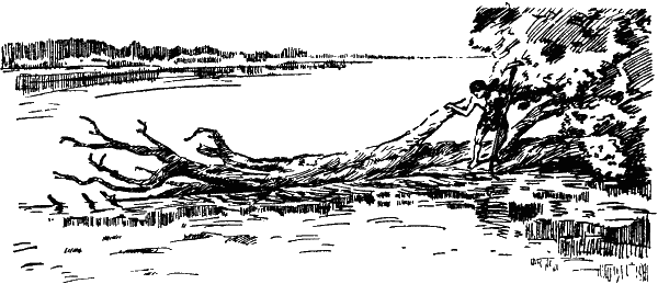 Водоворот повернул громадное дерево так, что корнями оно оказалось в заливчике, берега которого густо обросли кустарником. Корни плавучего ствола прочно переплелись и сцепились с береговыми кустами, и течение уже не могло унести дерево; оно лежало на воде подобь лодочному причалу.
