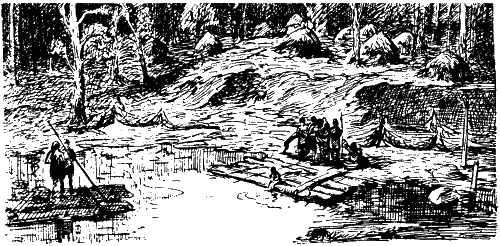 * * *Шли годы. Люди Воды совершенствовались в постройке плотов. Они уже скрепляли по нескольку бревен, привязывая их концы к толстым поперечинам. Такие плоты были очень устойчивы и поднимали по десять человек сразу.