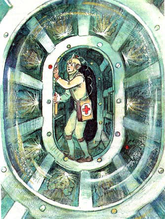 Тишина в отсеках полётного сна казалась вечной. Лишь изредка в каюте врача раздавался требовательный сигнал сирены, тогда Лон-Гор торопливой, но неслышной походкой проскальзывал к отсекам, поворачивал нужный, зелёный, красный или синий, кран, и опять наступала тишина.