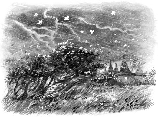 Однажды вечером разразилась сильная буря. Думая, что эту бурю вызвал злой Урфин Джюс, жевуны ёжились от страха и ждали, что их домики вот-вот рухнут.