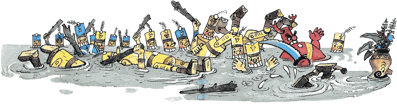 Урфин Джюс сердито плюнул и принялся строить плот. Спасение армии отняло у него больше суток. Деревянное воинство имело жалкий вид: краска на туловищах облупилась, разбухшие от воды руки и ноги двигались с трудом.