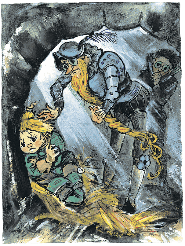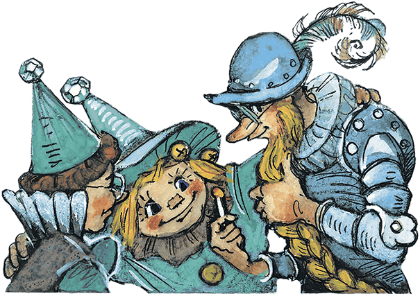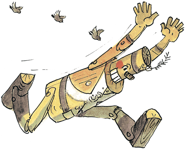 Дуболомы напрасно размахивали саблями и дубинками, птицы ловко увертывались, и удары попадали не туда, куда следует. Голубой солдат ткнул в руку зеленого, и тот, рассердившись, накинулся на него. А когда капрал Гитон бросился их разнимать, оранжевый дуболом, целясь в галку, отсек капралу ухо.