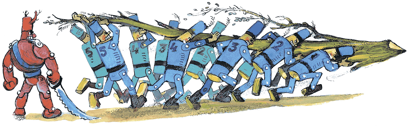 – Урфин Джюс привел с собой много солдат, но они все деревянные. Мой друг Дровосек, правитель страны Мигунов, один, но он железный. Железо не рубят деревом, а дерево рубят железом. Значит, железо крепче дерева, и если Железный Дровосек вовремя подоспеет к нам на помощь, он разобьет деревянную армию Урфина.
