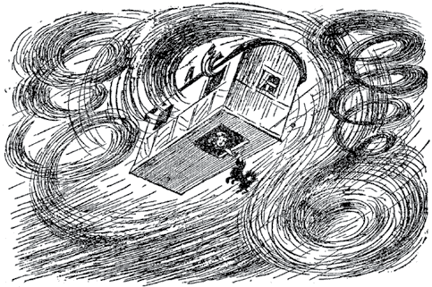 И в это время случилась удивительная вещь. Домик повернулся два или три раза, как карусель. Он оказался в самой середине урагана. Вихрь закружил его, поднял вверх и понес по воздуху.