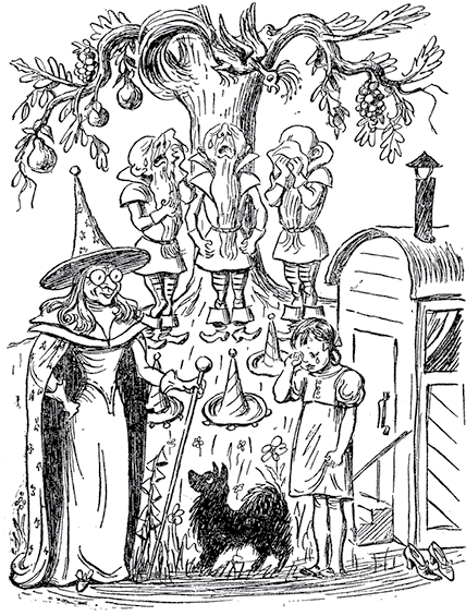 Виллина наклонилась к огромной книге, и та тотчас сжалась до размеров наперстка и исчезла в складках мантии. Налетел вихрь, стало темно, и, когда мрак рассеялся, Виллины уже не было: волшебница исчезла. Элли и Жевуны задрожали от страха, и бубенчики на шляпах маленьких людей зазвенели сами собой.