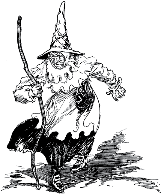 Около изгороди стоял длинный шест, на нем торчало соломенное чучело – отгонять птиц. Голова чучела была сделана из мешочка, набитого соломой, с нарисованными на нем глазами и ртом, так что получалось смешное человеческое лицо. Чучело было одето в поношенный голубой кафтан; кое-где из прорех кафтана торчала солома. На голове была старая потертая шляпа, с которой были срезаны бубенчики, на ногах – старые голубые ботфорты, какие носили мужчины в этой стране.