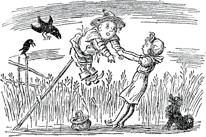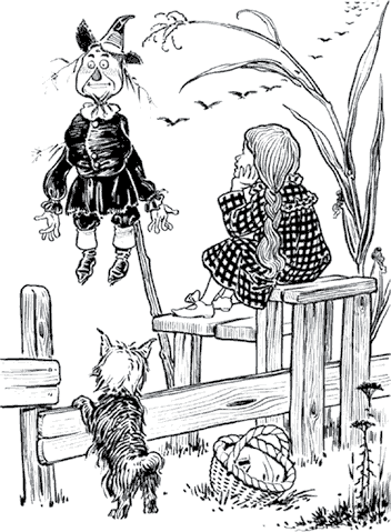 Элли внимательно разглядывала смешное разрисованное лицо чучела и удивилась, увидев, что оно вдруг подмигнуло ей правым глазом. Она решила, что ей почудилось: ведь чучела никогда не мигают в Канзасе. Но фигура закивала головой с самым дружеским видом.