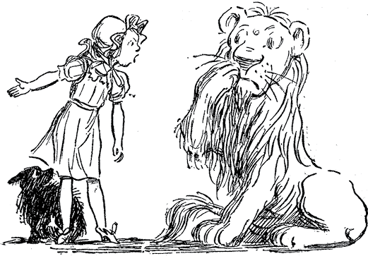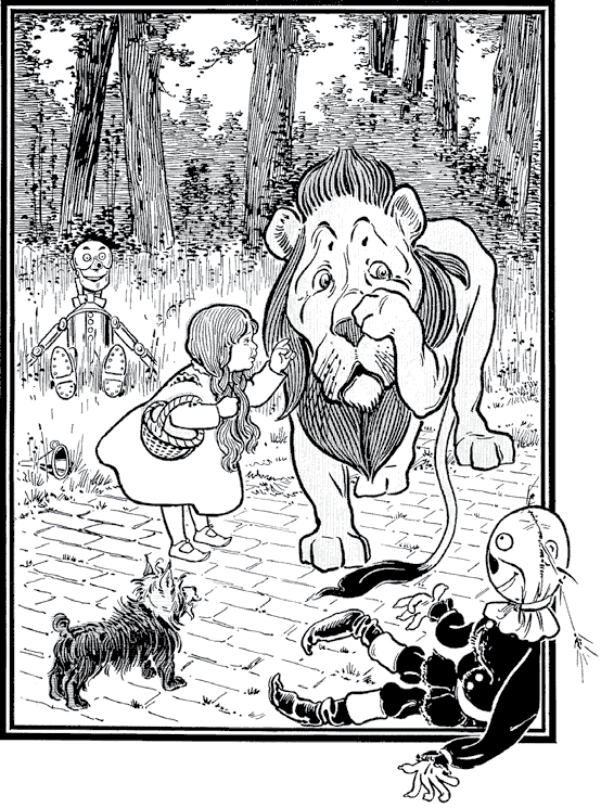 Эта мирная беседа была прервана громовым рычанием. На дорогу выскочил огромный Лев. Одним ударом он подбросил Страшилу в воздух; тот полетев кувырком и упал на краю дороги, распластавшись, как тряпка. Лев ударил Железного Дровосека лапой, но когти заскрипели по железу, а Дровосек от толчка сел, и воронка слетела у него с головы.
