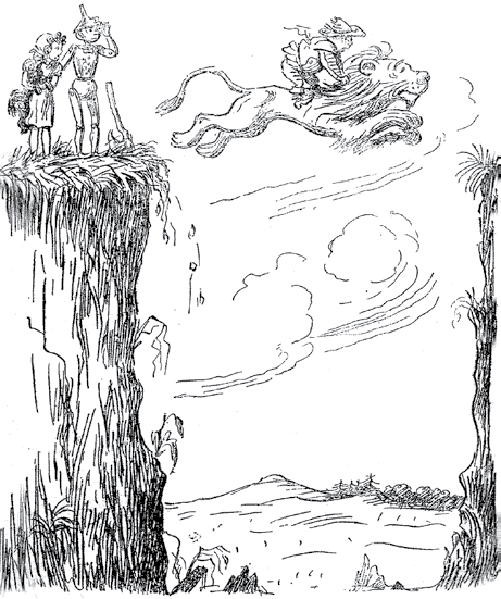 Лев, замыкавший шествие, обернулся к тиграм и испустил такое великолепное рычание, что Элли с перепугу чуть не свалилась в пропасть. Даже чудовища остановились и глядели на Льва, не понимая, как такой небольшой зверь может так громко реветь.