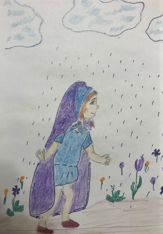 Варвара бежала очень быстро. В дорогу её собирали всем селом. Красные крепкие башмачки не боялись луж и грязи. Плащ-непромокайка помогал сохранить тепло и остаться сухой. Цветы василька на косынке делали девочку незаметной в поле для недругов. Деревянный крестик на груди придавал крепость духа. Без Божьей помощи никак!