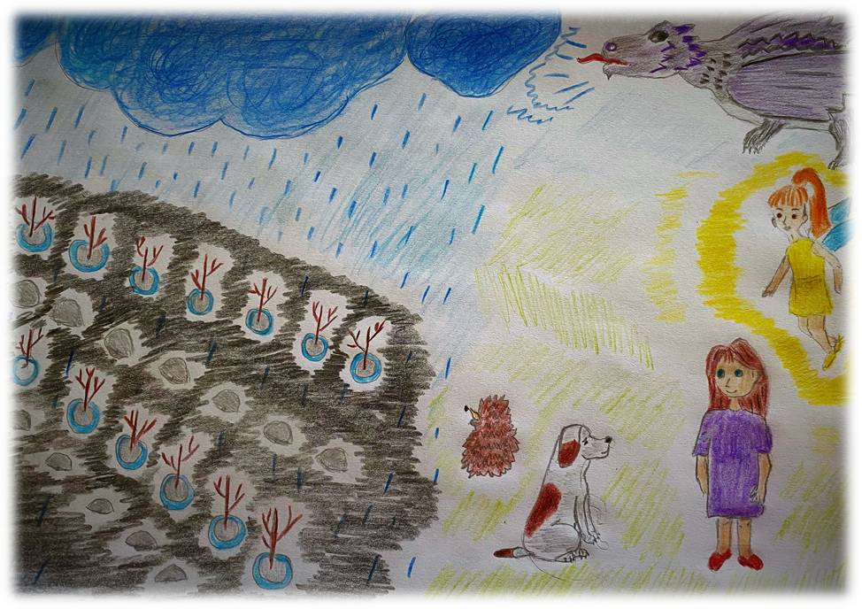 Дракон понял. Зелёный леший ему не нравился. А вот девочка и фея смягчили сердце. Любил дракон тепло и огонь. А тут малышка светится и греет. Какая доброта и красота! Ещё дракон понял, что всем нужна вода. Взмахнув серыми крыльями, он молча взлетел и удалился. Животные обрадовались и стали весело плескаться в озере. Вода – это жизнь!
