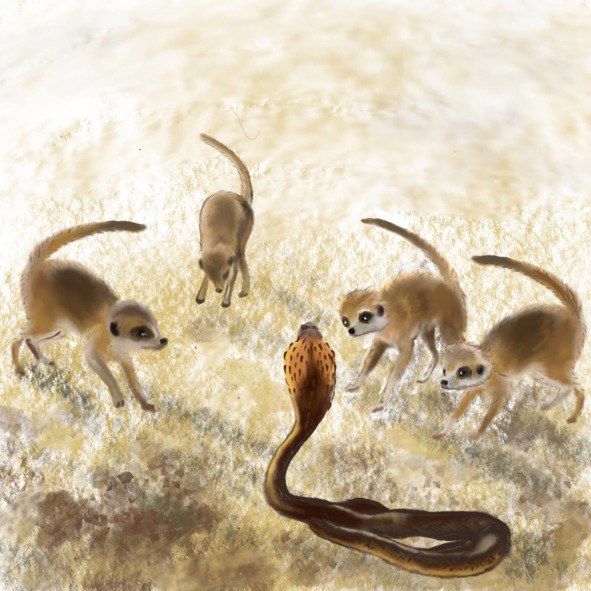 Часовые уже успели совершить три обманных манёвра, когда им на помощь пришли ещё пятеро охотников, услышав сигнал тревоги. Теперь восемь взрослых сурикатов противостояли опасному хищнику. Змея начала уставать, её броски становились всё более редкими и всё более предсказуемыми. И после ещё нескольких бесплодных попыток познакомить сурикатов со своим ядом она ретировалась. Часть охотников преследовала её какое-то время, но удостоверившись, что опасности она больше не представляет, отправились по своим делам. Часовые тоже вернулись к своим обязанностям, и жизнь поселения продолжилась в прежнем размеренном темпе.