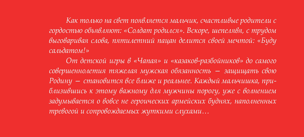 Служба распределялась на условные, неизвестно кем установленные периоды армейского существования со статусом, который определял сущность отношений старшего призыва к его обладателю. И первое, что открывалось новобранцам, – это то, что они пришли не пополнить большую семью, а принять тяжкий груз бремени, сброшенный другими. Во всем была какая-то огромная несправедливость, которую никто в мире не мог исправить.