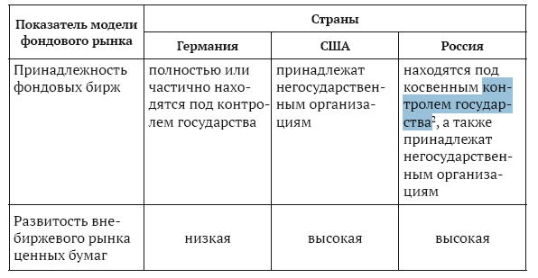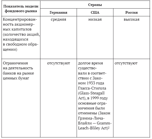 Традиционно считается, что в каждом государстве существуют различные системы организации рынка ценных бумаг. В этой связи говорят о наличии различных моделей фондового рынка. Базовыми моделями считаются американская модель (США) и немецкая модель (ФРГ)[45]. В остальных государствах в той или иной степени сочетаются различные черты, присущие указанным выше моделям, что позволяет говорить об их смешанном характере (и Россия не является исключением).