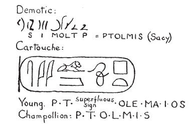 Рис. 2. Демотическое письмо и картуш Птолемея, прочтение де Саси, Юнга и Шампольона