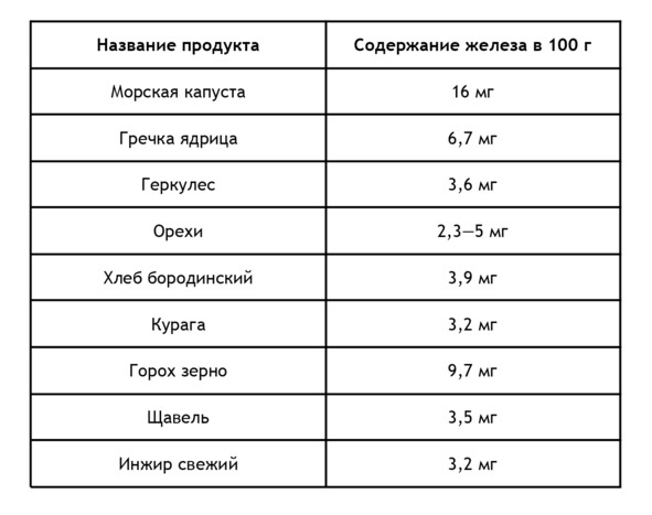 Негемовое железо содержится в продуктах растительного происхождения, правда его биодоступность составляет лишь 10%. Содержание железа в продуктах растительного происхождения из расчета на 100 г21: